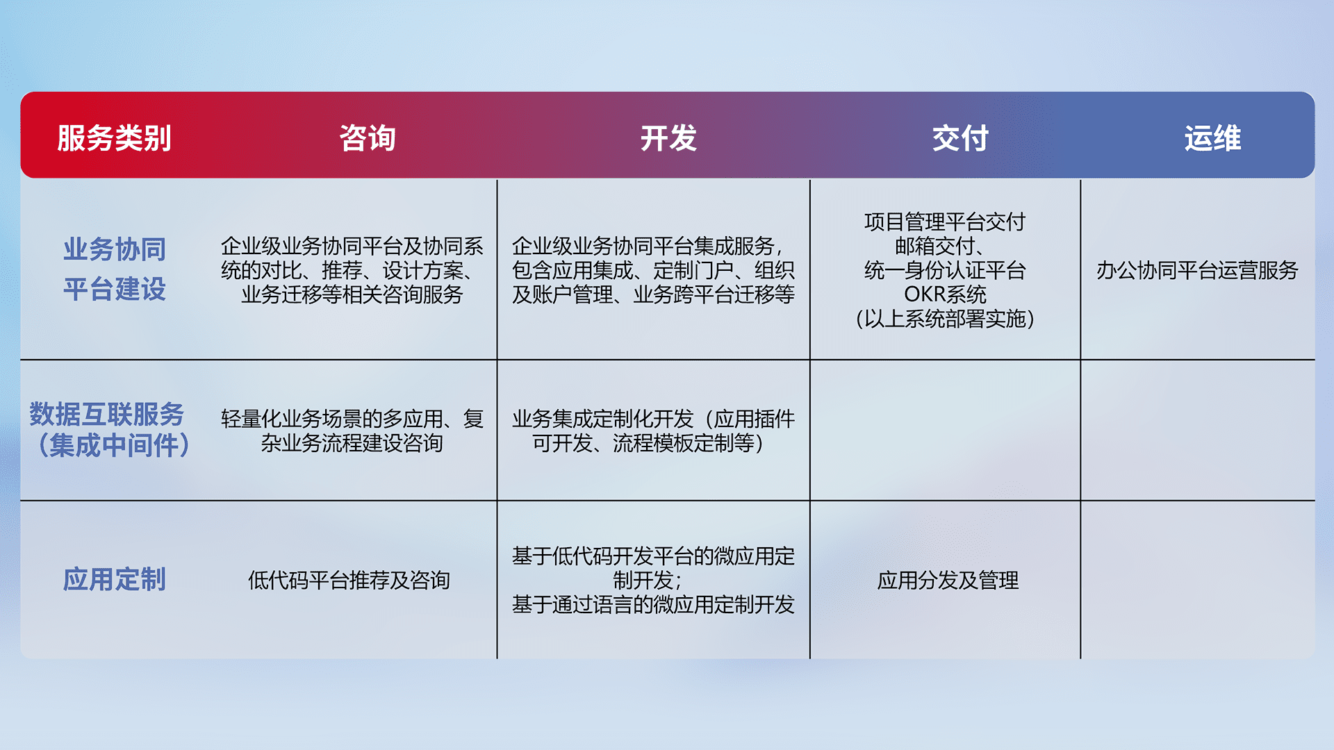 针对钉钉、、、、企微、、、、IDaas等平台级产品提供产品的规划、、、、方案、、、交付、、定制化开发等服务,,,,实现如统一协同办公、、智能客户服务、、混合会议管理、、智能数据查询、、、等业务场景,,,,实现数字化转型。。。。