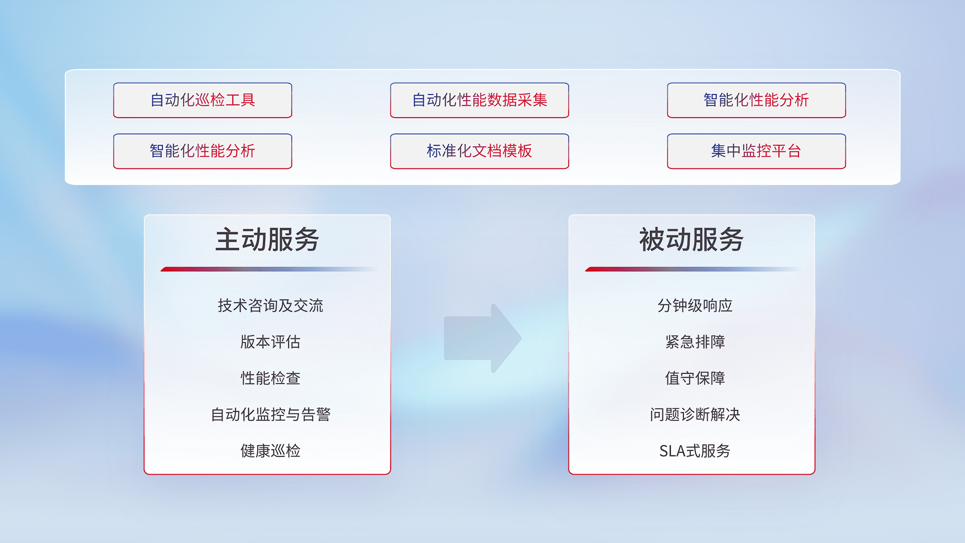 智能化工具和标准化文档,,,保障服务质量,,,,提供主动服务(包含技术咨询、、、、版本评估、、性能检查、、、、自动化监控与告警、、、健康巡检)和被动服务包含(分钟级响应、、、紧急排障、、、、值守保障、、问题诊断解决、、SLA服务)。。。。